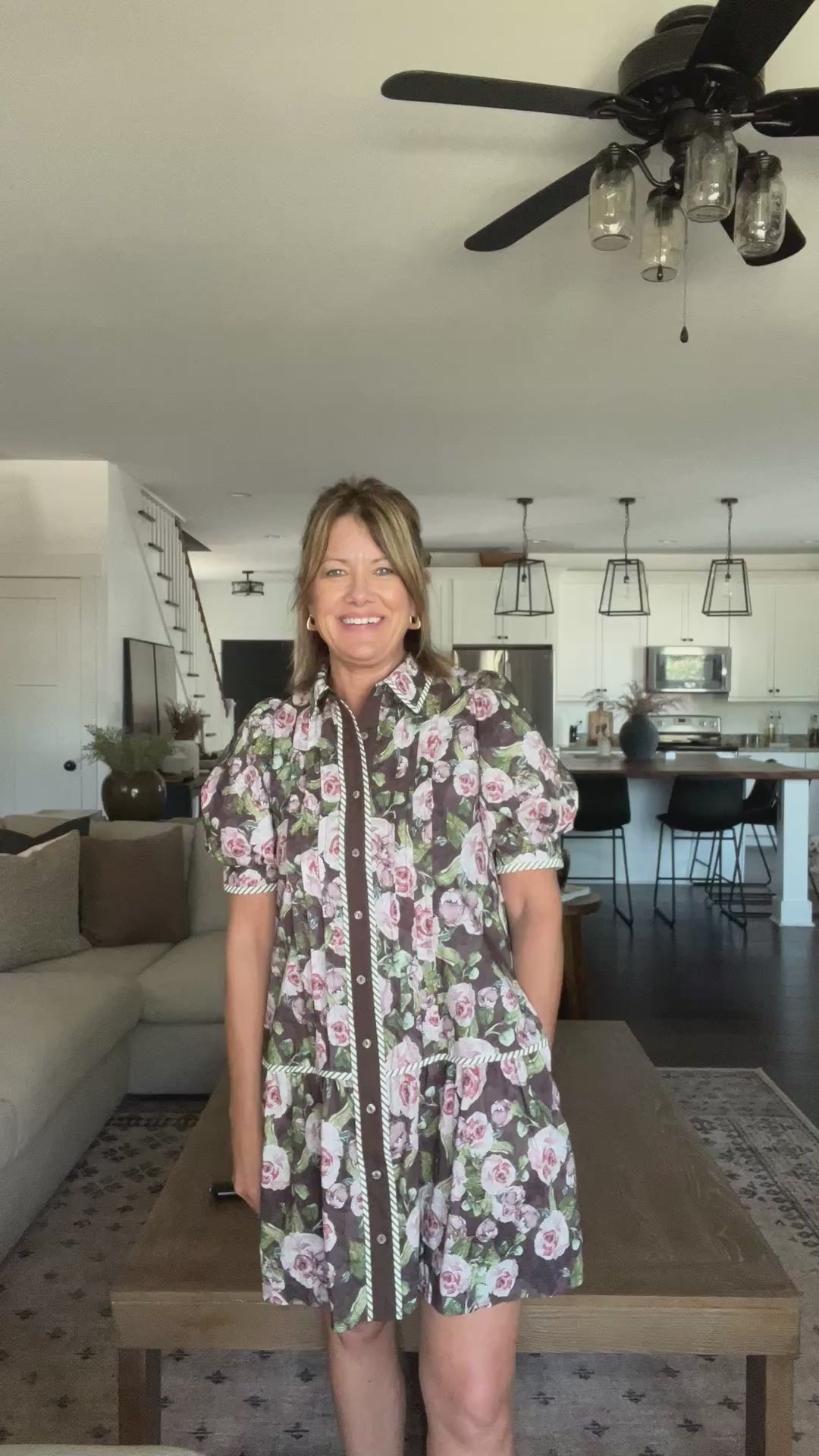 Floral print short puff sleeve mini dress featuring contrast stripe binding trim and button closure at front. Pocket at side. Lined. Woven. Non-sheer. Lightweight.